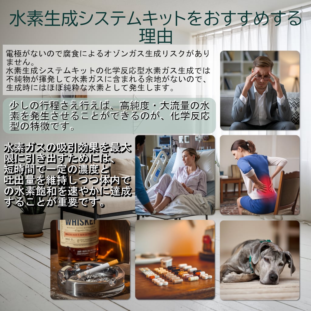 コストを抑えつつ、水素の特性を十分に活かせる選択肢として、日々の健康管理からコンディション調整まで自在に活用できます。