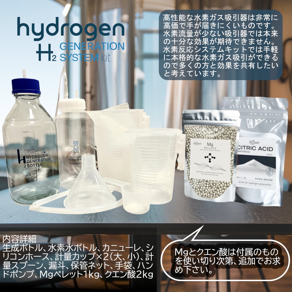 生成ボトル、水素水ボトル、カニューレ×2、シリコンホース、計量カップ×2(大、小)、計量スプーン、漏斗、保管ネット×2、手袋、ハンドポンプ、集水器、Mgペレット1kg、クエン酸2kg、説明書