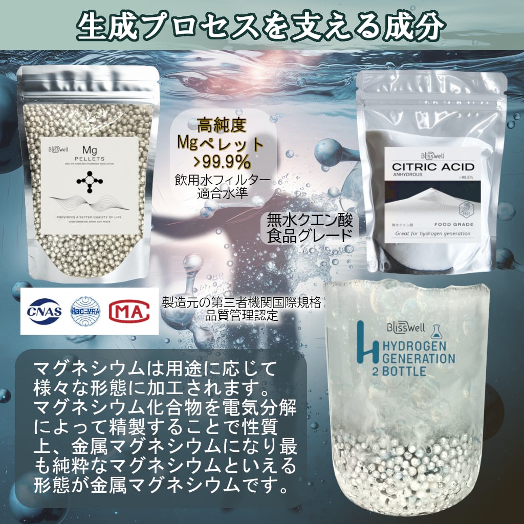 付属のマグネシウムは国内の成分分析機関で純度検査を行い、飲用水フィルター適合水準の純度99.9%を確認済み。